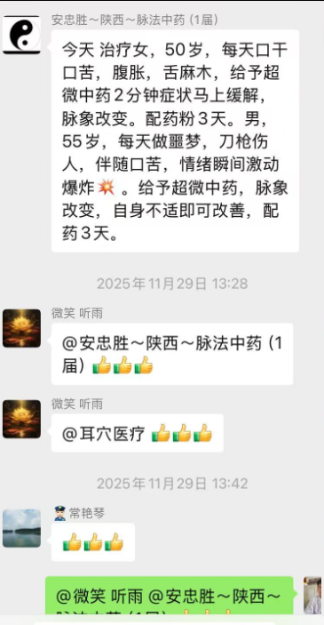 今天治疗女,50岁,每天口干口苦,腹胀,舌麻木,给予超微中药2分钟症状马上缓解,脉象改变,配药粉3天。