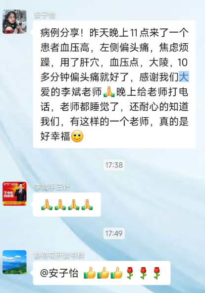 昨天晚上11点来了一个患者血压高,左侧偏头痛,焦虑烦躁,用了肝穴,血压点,大陵,10多分钟偏头痛就好了,感谢我们大爱的李斌老师晚上给老师打电话,老师都睡觉了,还耐心的指导我们,有这样的一个老师,真的是:好幸福!