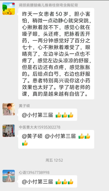 昨天一女患者50岁,胆小害怕,稍微一点动静心就突突跳心揪揪着放不下,感觉心就在嗓子眼,头还疼,把脉看舌开药,一两分钟感觉好了百分之七十,心不揪揪着难受了,眼睛亮了,左边半边头一点也不疼了,感觉左边头凉凉的舒服但是右边还有点疼,感觉胀胀的。