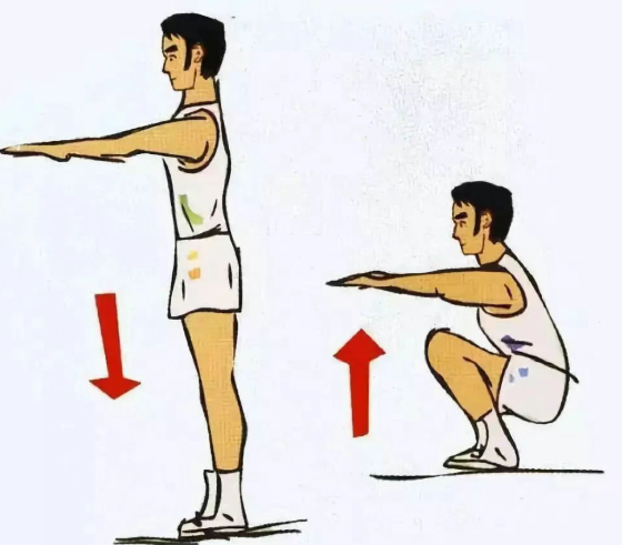 两脚自然分开,与肩膀同宽;双臂向前伸直,膝盖弯曲,注意呼吸,慢慢下蹲。