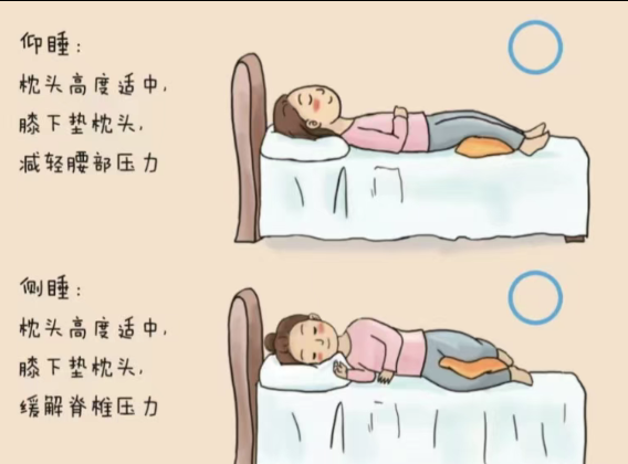 选对姿势:优先选择仰卧或侧卧(之前跟大家详细说过的睡姿),避免趴着睡。仰卧时可在膝盖下方垫个薄枕,侧卧时在两膝间夹个枕头,让腰椎保持自然曲线,减少腰部压力。
