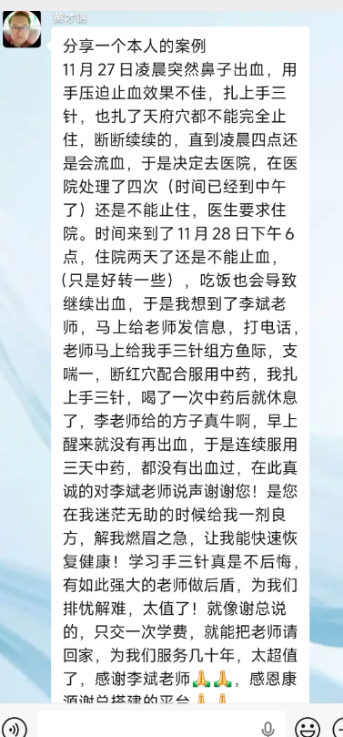 李老师给的方子真牛啊,早上醒来就没有再出血,于是连续服用三天中药,都没有出血过,在此真诚的对李斌老师说声谢谢您!是您在我迷茫无助的时候给我一剂良方,解我燃眉之急,让我能快速恢复健康,学习手三针真是不后悔,有如此强大的老师做后盾,为我们排忧解难,太值了!